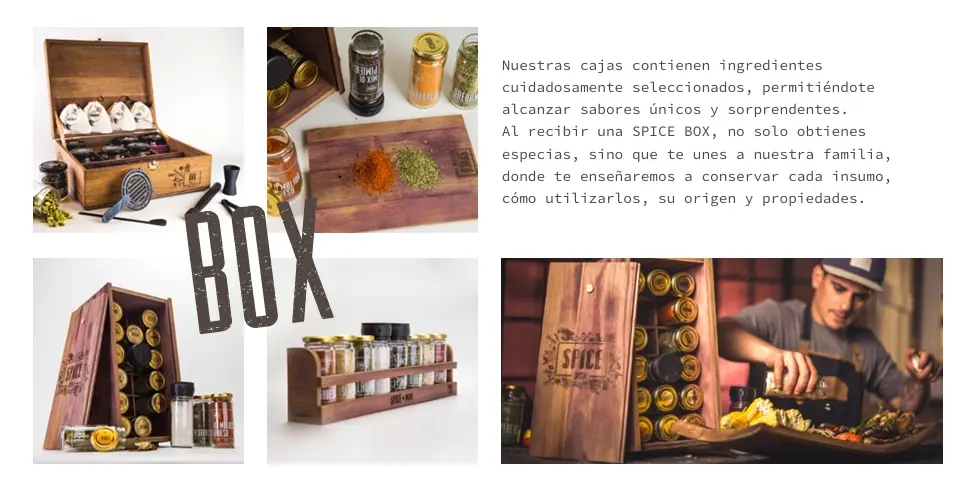 Nuestras cajas contiene ingredientes cuidadosamente seleccionados, permitiéndote alcanzar sabores únicos y sorprendentes. Al recibir una SPICE BOX, no solo obtienes especias, si no que te unes a nuestra familia, donde te enseñaremos a conservar cada insumo, como utilizarlo, su origen y propiedades.